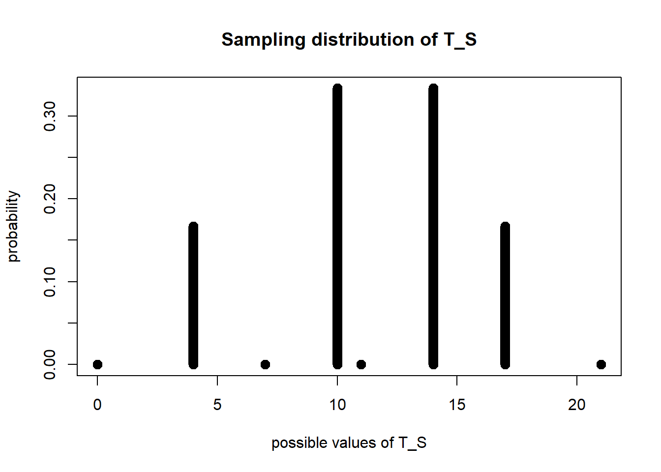 To visualize the sampling distribution of \(T_S\), we can draw a plot of the probabilities of different actual values of \(T_S\):